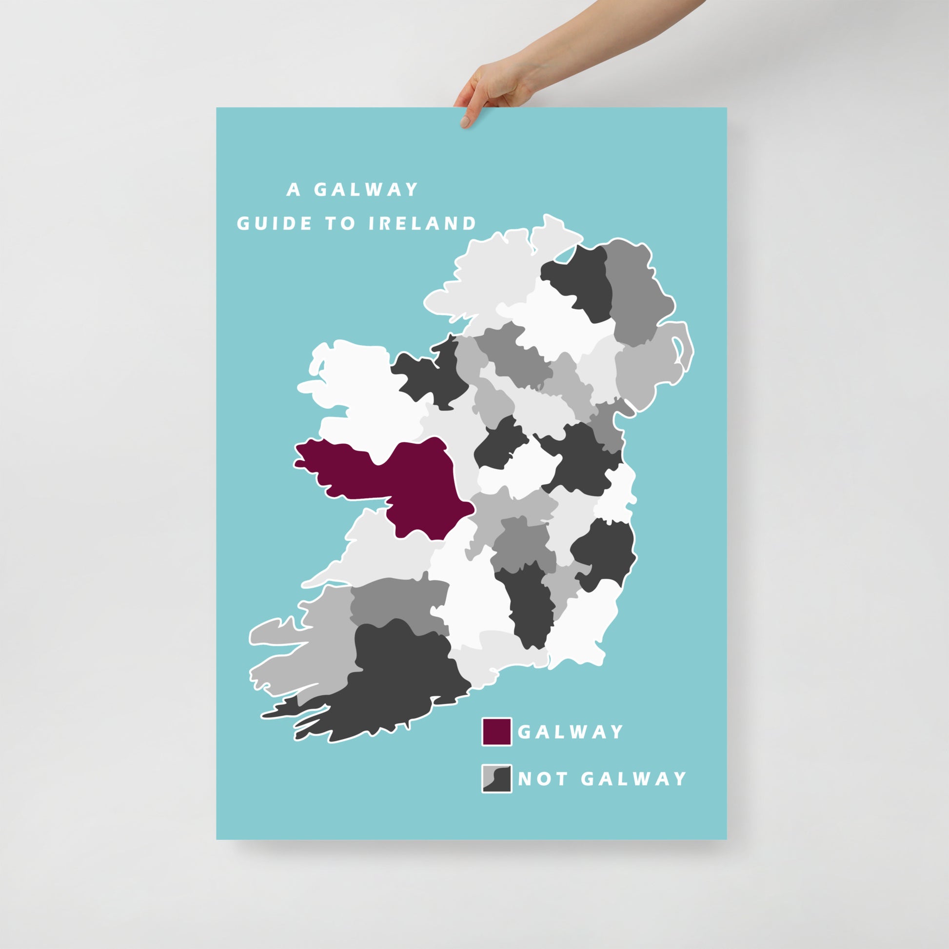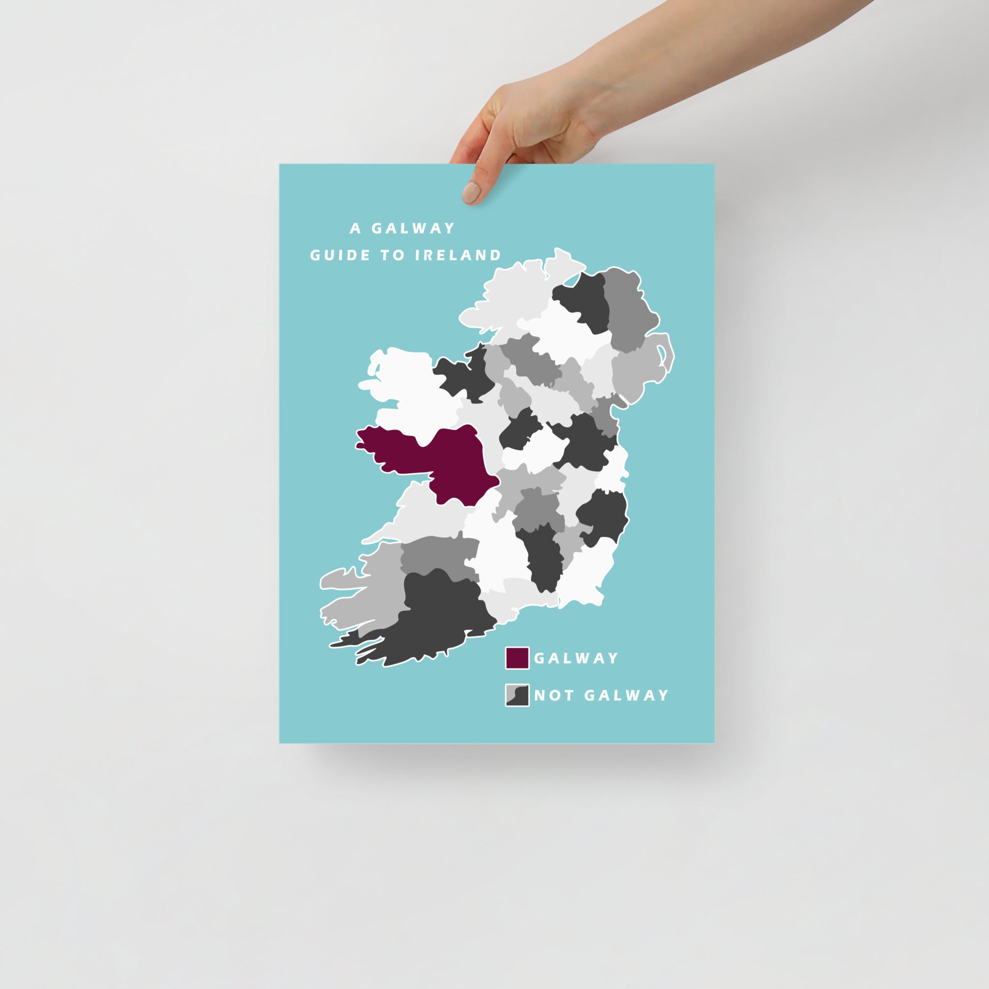 This is an original poster which illustrates a map of Ireland from the perspective of a County Galway native. The colourful key is separated into two sections, “Galway” and “Not Galway”.