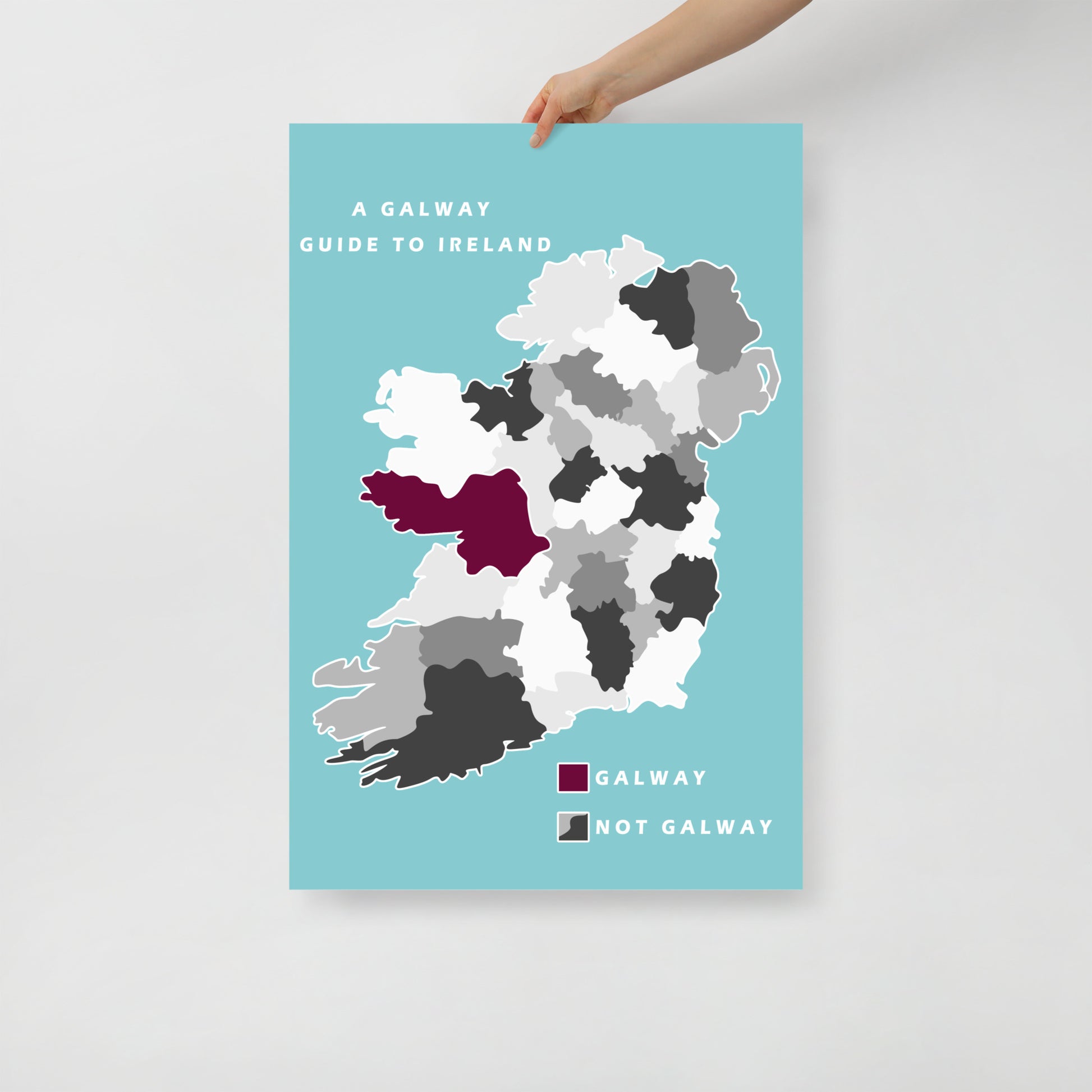 This is an original poster which illustrates a map of Ireland from the perspective of a County Galway native. The colourful key is separated into two sections, “Galway” and “Not Galway”.