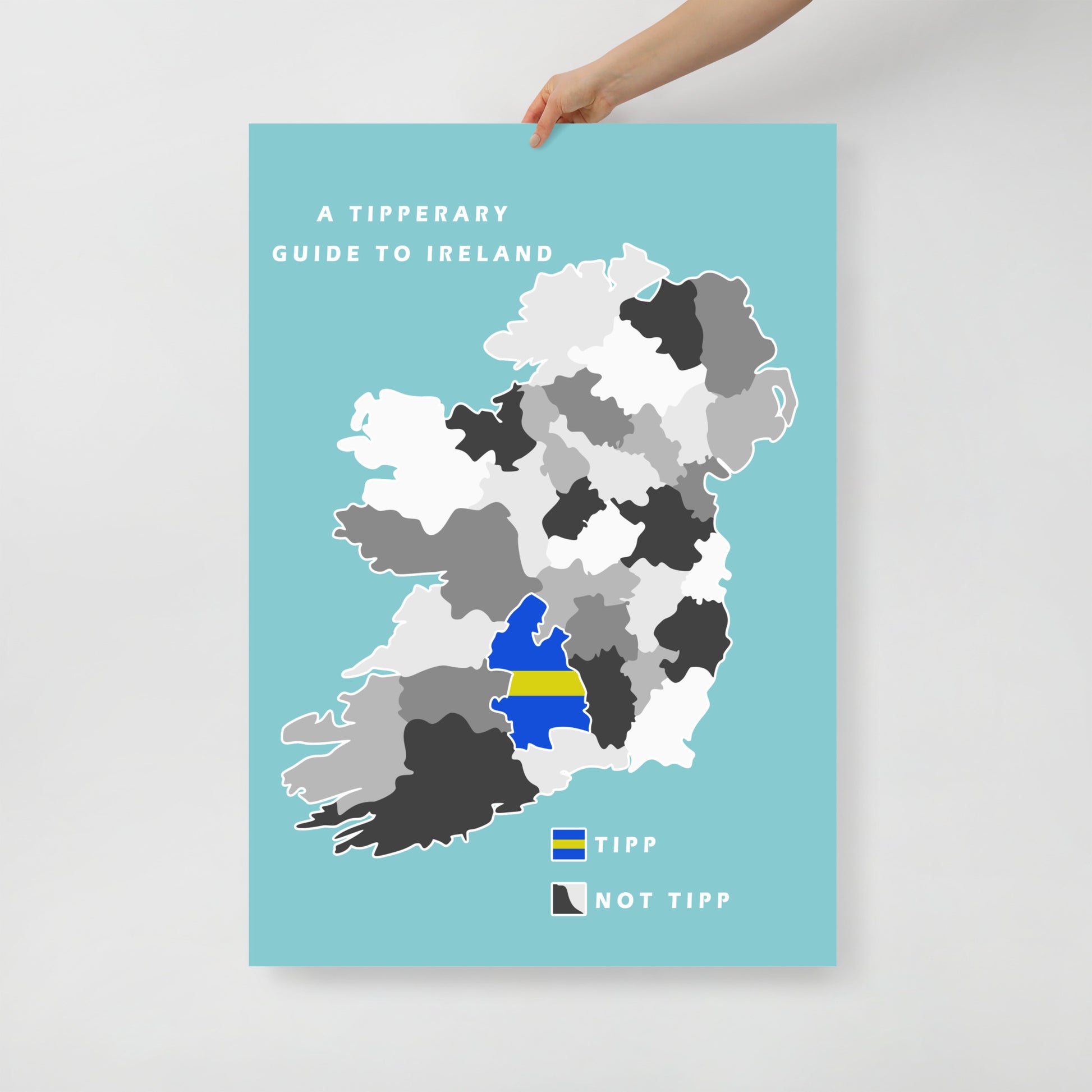 This is an original poster which illustrates a map of Ireland from the perspective of a County Tipperary native. The colourful key is separated into two sections, “Tip” and “Not Tup”.