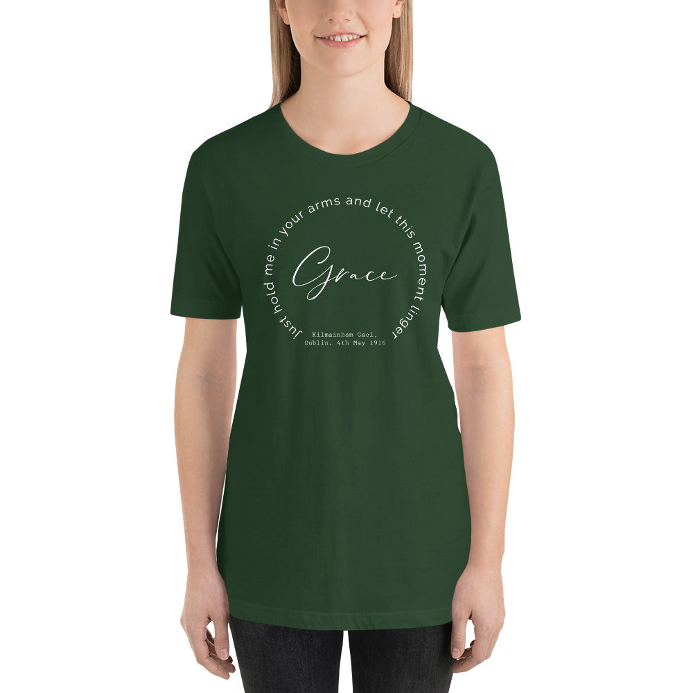 Dress with meaning in this striking Grace Gifford T-shirt, which displays lyrics from the popular Irish song "Grace," about a woman who married one of the 1916 Easter Rising leaders hours before he was executed. Available in white, heather black, and black, this comfy shirt gives a special nod to Irish history.