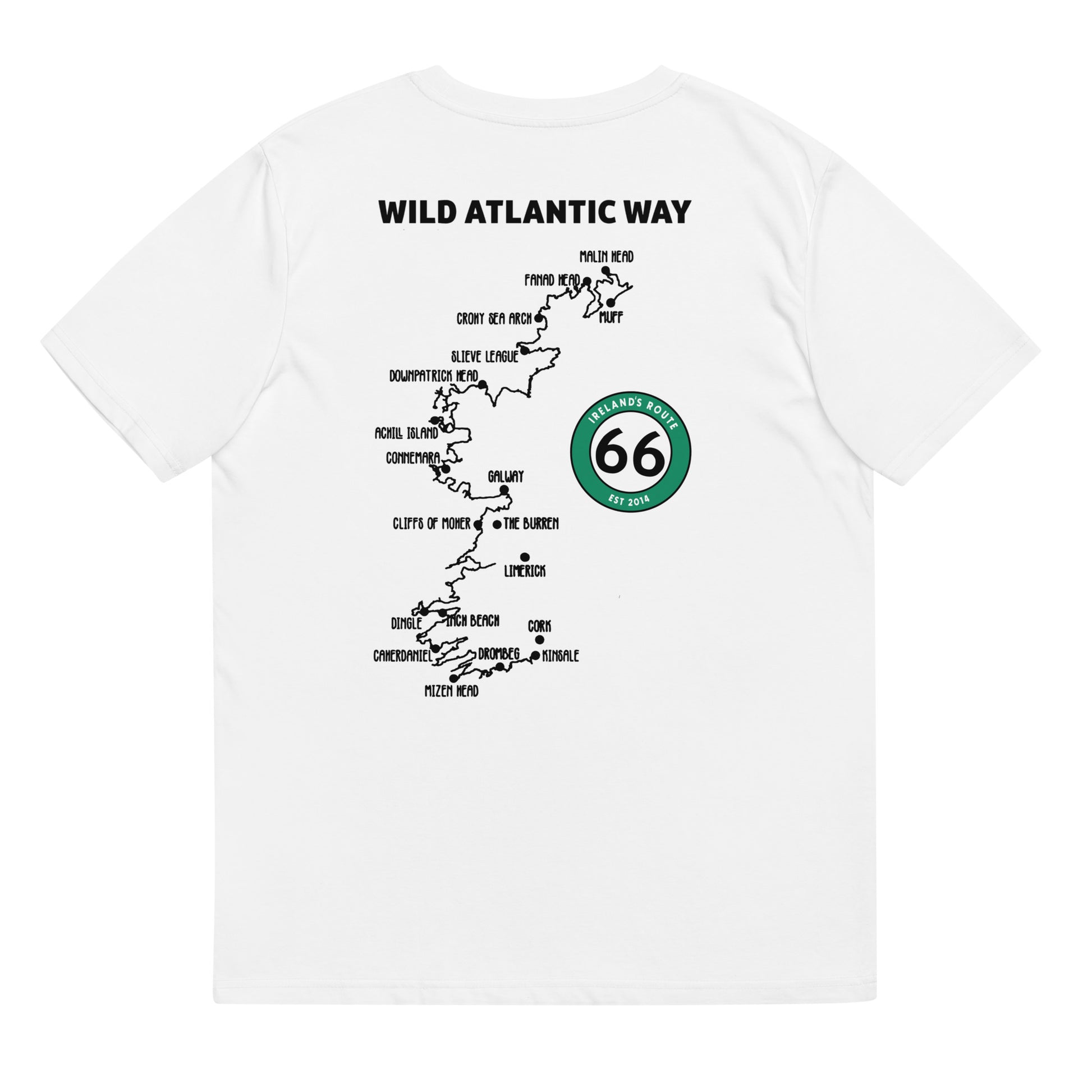 The front of the t-shirt has Wild Atlantic Way printed across the chest. The back has a signature map pointing to the spectacular stops on Ireland’s west coast, Route 66.