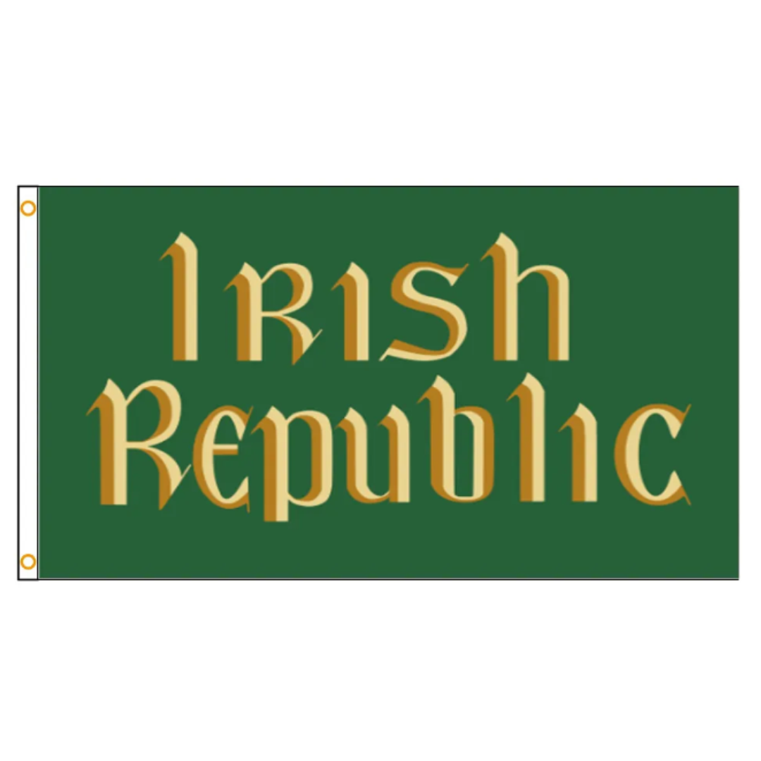 This is an 'Irish Republic' flag. A replica of one that was flown over the G.P.O. in 1916. The original flag was of green poplin cloth with the letters IRISH REPUBLIC painted in white and gold. This one is made from polyester and is sized at 90 x 150cm.
