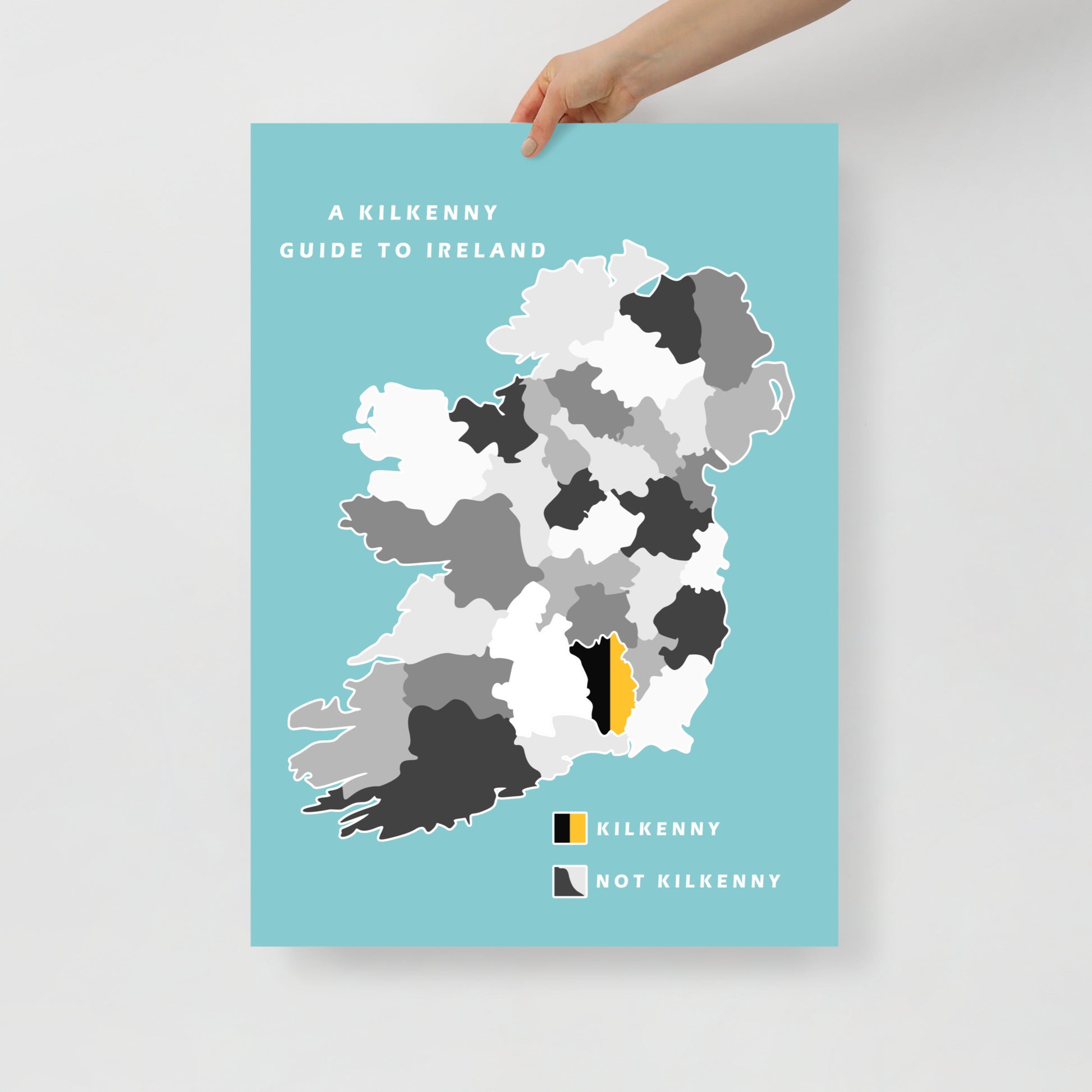 This is an original poster which illustrates a map of Ireland from the perspective of a County Kilkenny native. The colourful key is separated into two sections, “Kilkenny” and “Not Kilkenny”.