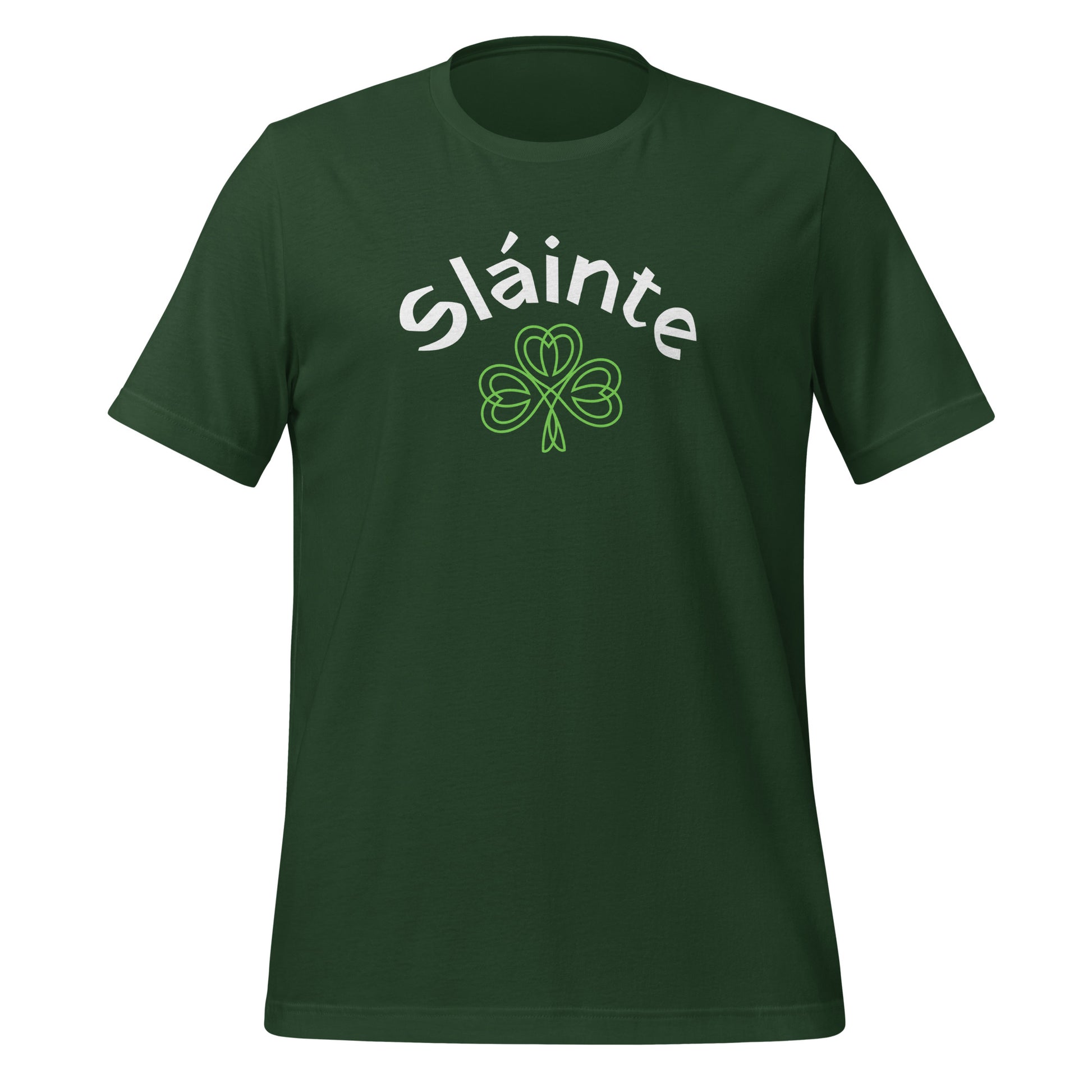 Wear your Irish pride as Gaeilge with our new Sláinte Green Shamrock Unisex T-shirt. This T-shirt displays the classic Irish toast in clean lettering with a green linework shamrock underneath.